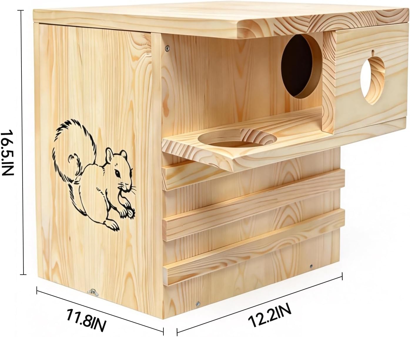 • 【Fits All Breeds】Universal 3.5-Inch Entry & Extra-Large Capacity:.Featuring an upgraded 3.5-inch entrance, this squirrel house comfortably fits larger species like Fox Squirrels and pregnant Gray Squirrels. The spacious 11.8" x 12.2" x 16.5" interior serves a dual purpose: a cozy communal bedroom and a secure winter food pantry. It’s the ultimate multi-functional habitat for Eastern Gray, Red, and Fox Squirrels.